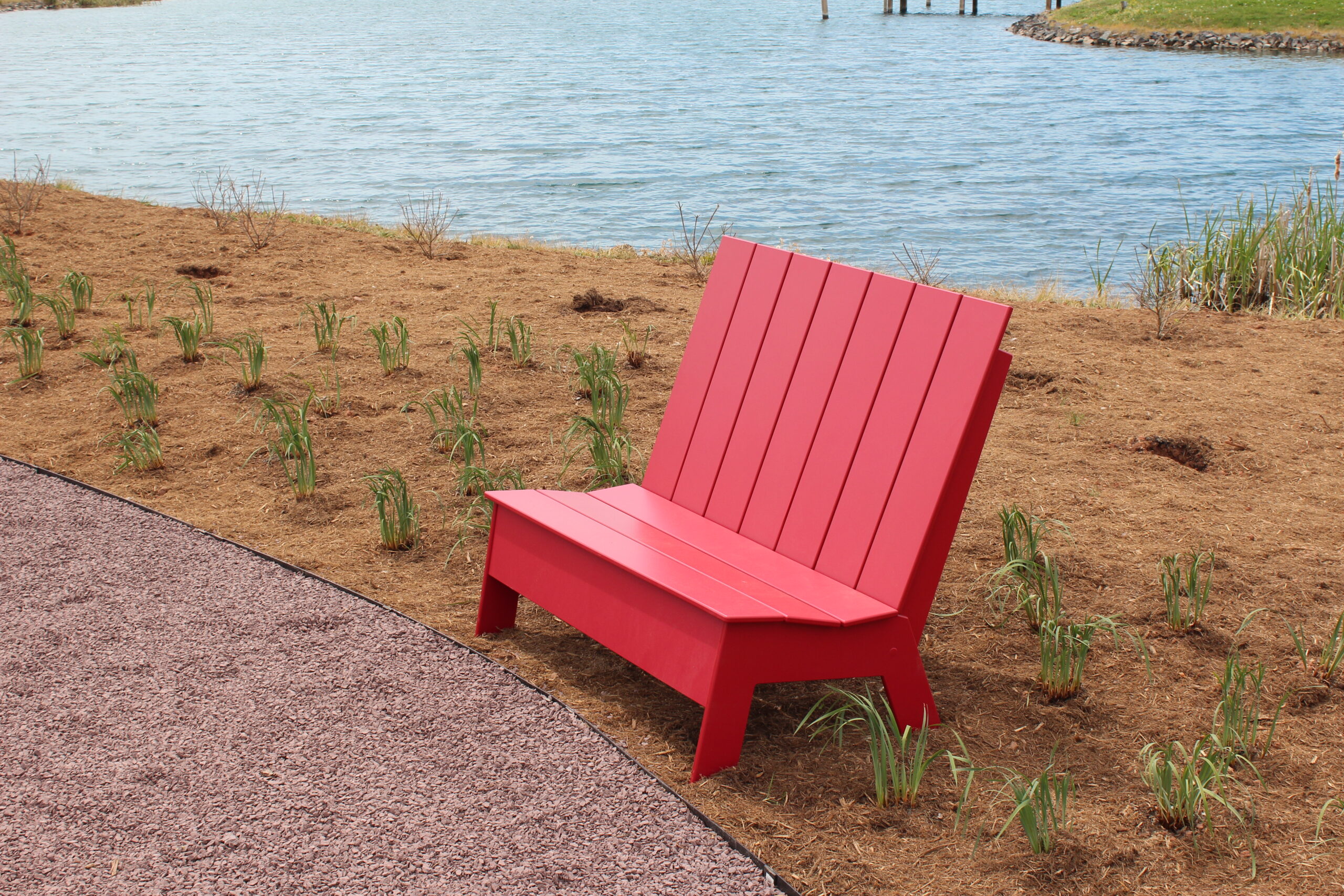I also love bringing big blocks of color into the landscape in other ways. When I designed the wedding gardens at Old House Vineyards, I had the opportunity to bring in a tremendous splash of color with these bright red benches. Are they a bold statement? Sure. And they work.