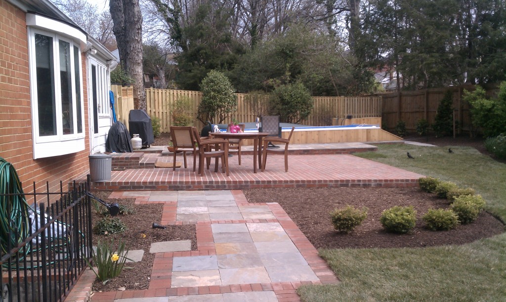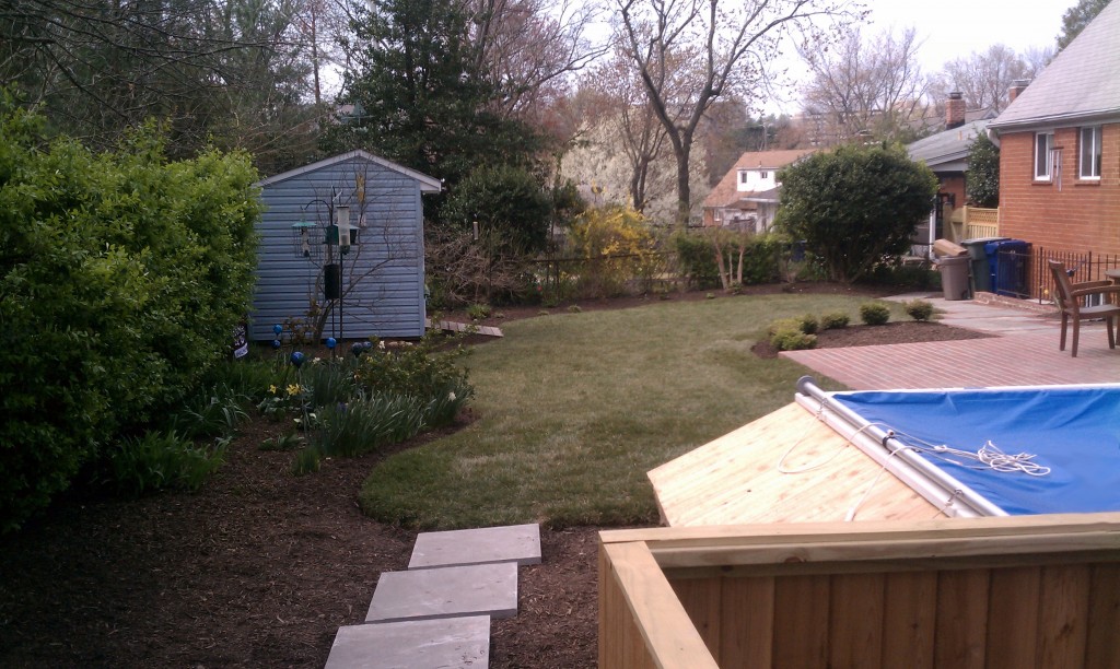 Last year I was contacted by some folks in Alexandria, Virginia, with an intriguing project: they have a small backyard, and wanted to install an Endless Pool without giving up the entire yard or making the pool an overwhelming, ugly, dominant feature. I did some research, and the design issues surrounding an Endless Pool are the same as those surrounding an acrylic spa – namely, that without finding a way to tuck it into the surrounding landscape, you have a 3-4′ tall box sitting on a slab. Here’s what the backyard looked like: