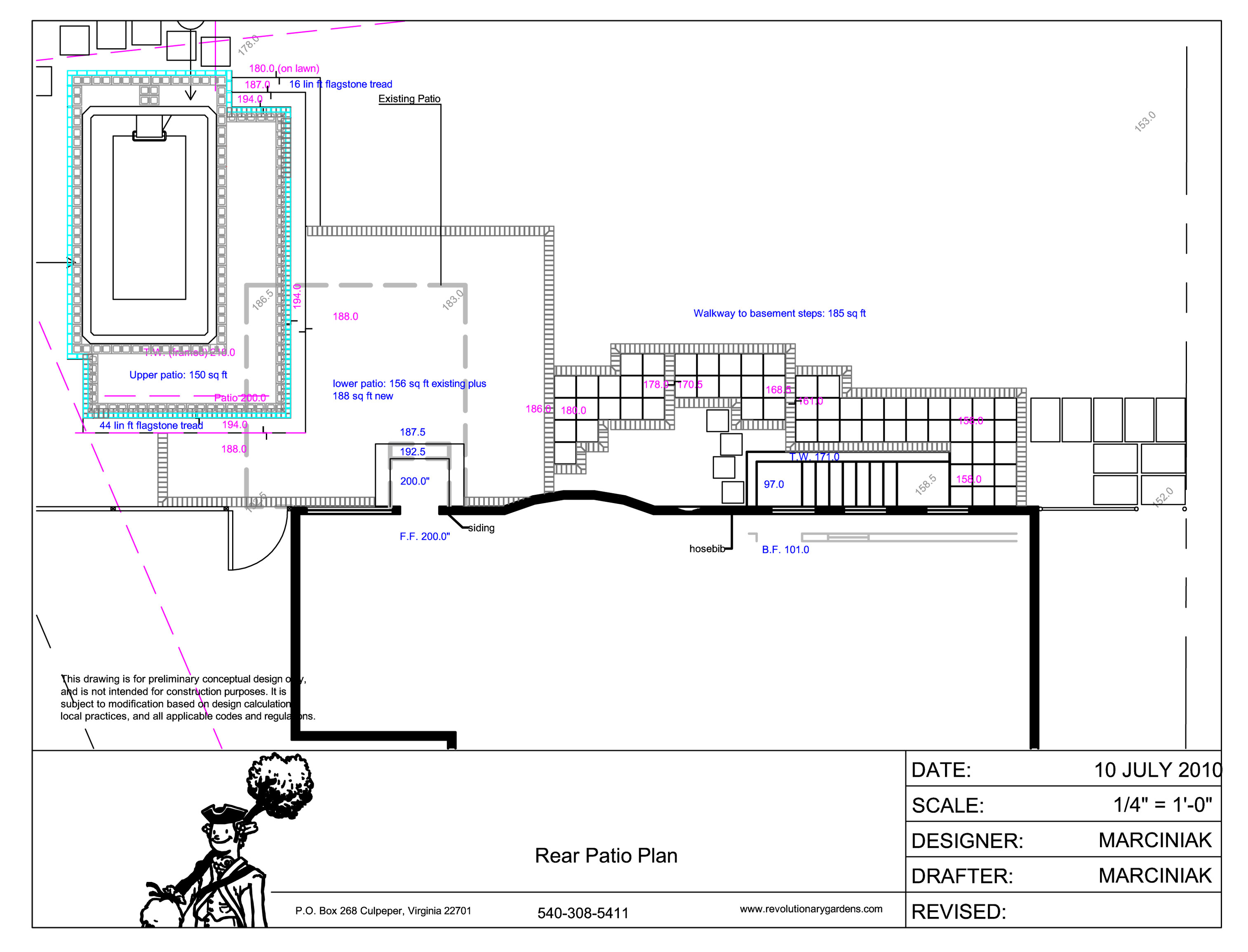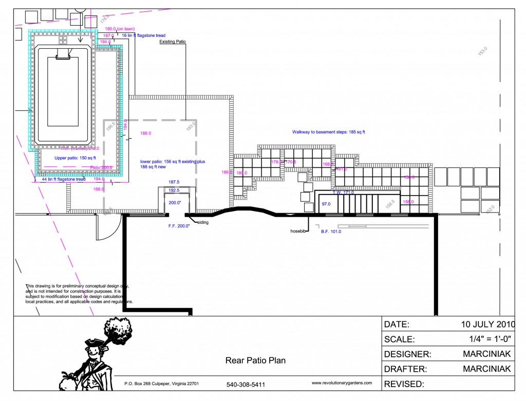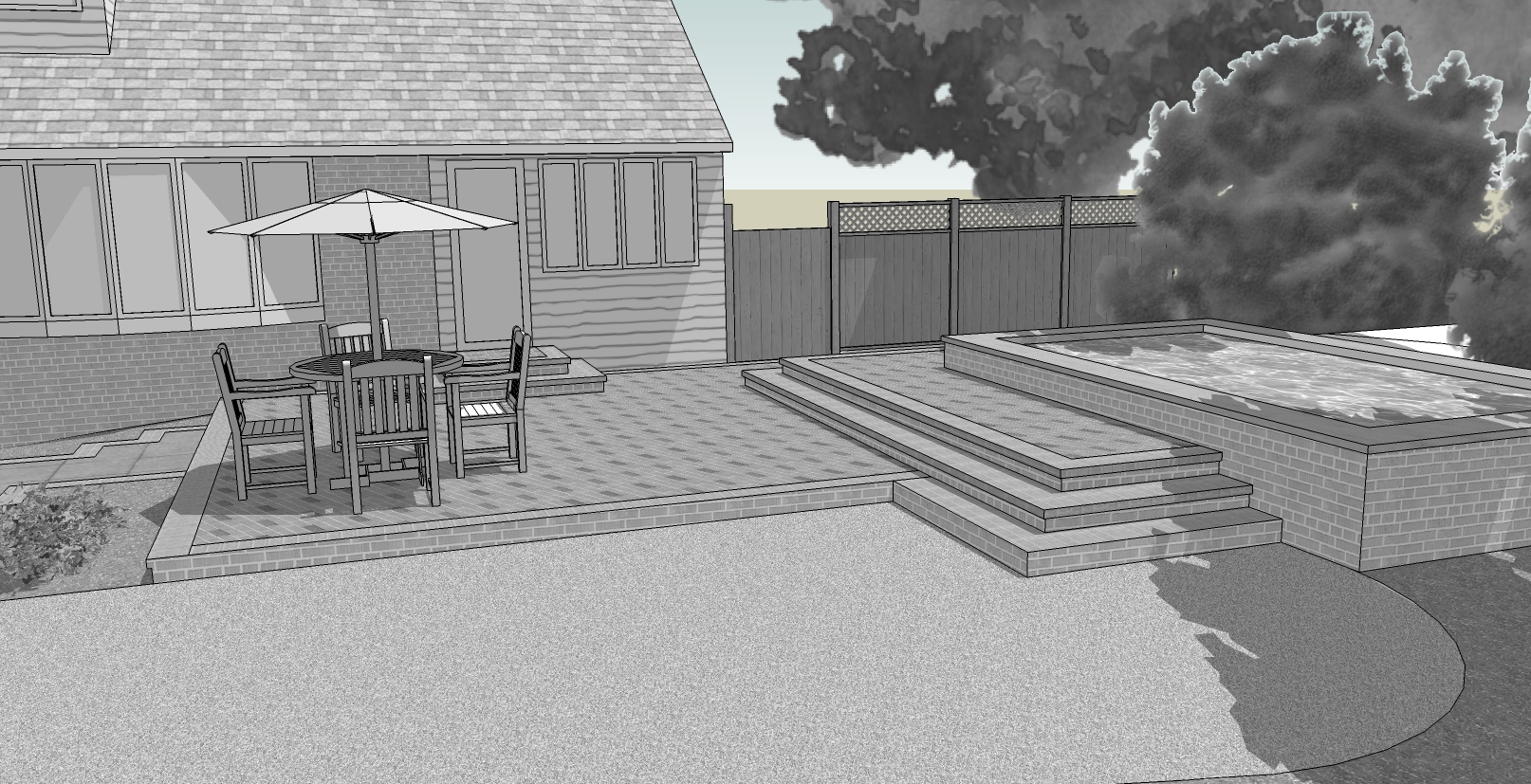 Clearly, the best way to deal with the pool was to partially sink it in the ground. Part of the design process involved a lot of phone calls with the smart people division of Endless Pools, along with emailing back and forth lots of CAD drawings to get the technical details right (note: your random landscapers offering “free designs and estimates” don’t do this level of service). I ended up with a concept that played off the existing shapes, enlarged the patio, and kept the pool tucked down a bit.