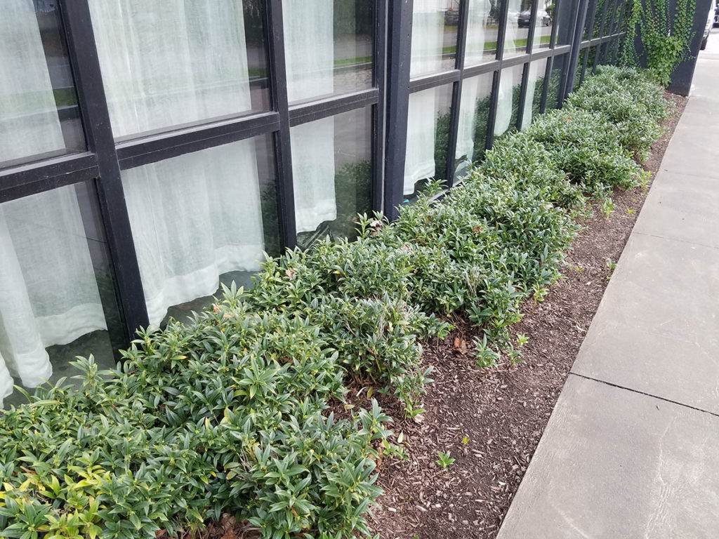 Let’s start with the common name. Sweetbox is so named because of the sweetly scented spring flowers it produces. The foliage is a gorgeous, glossy green. Sweetbox is one of my problem solver plants. In terms of light requirements, less light is better. It’ll start to thin out and fade away with too much sun, so partial to full shade is better. It also stays small, maxing out at 12-15 inches tall. Spread is typically listed at 2 to 4 feet and that really just depends on how happy it is.