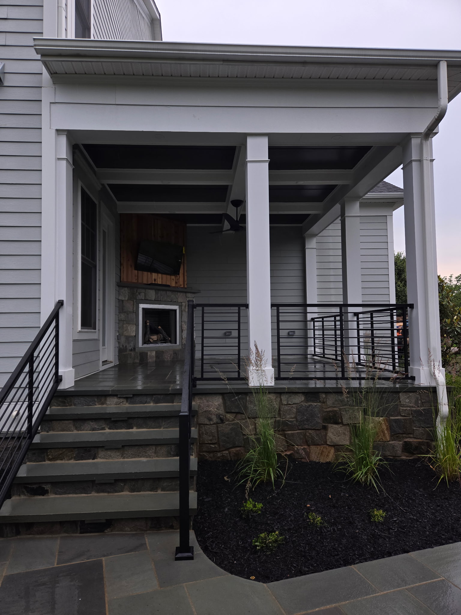 We even upgraded the existing back porch! We couldn’t vault the ceiling due to the way the home was constructed so we did the next best thing. Additionally, we got rid of the flat, boring, builder-grade ceiling and built a set of faux beams. We then painted the ceiling a dark color (Sherwin Williams Iron Ore) to make the ceiling appear higher. The porch is finished off with a new gas fireplace.