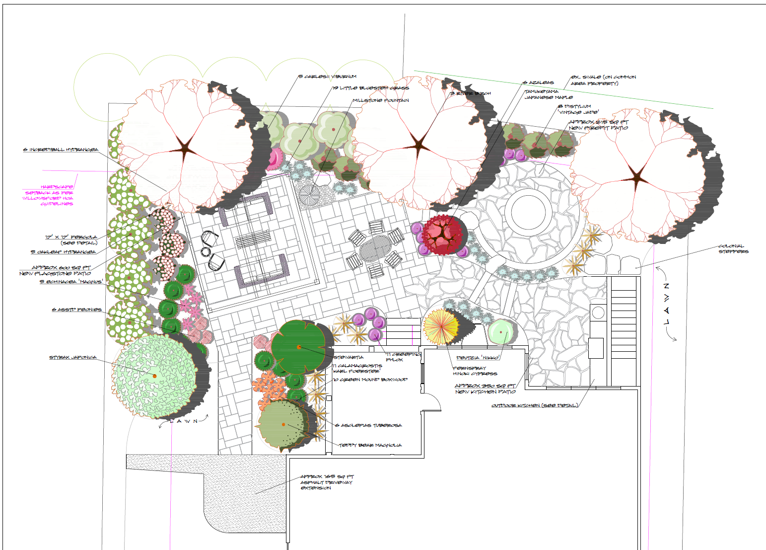 Some of my favorite projects include these Willowsford landscape design and installations. This first project included extensive plantings around a new pavilion and patio. Our clients were looking for lush plantings to soften the new construction and we had a blast doing it.